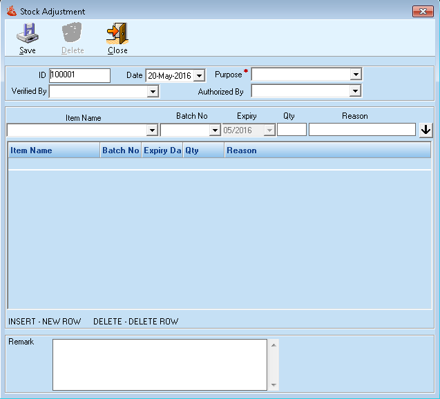 - Press the “Delete” button on the menu, or press “Alt + D” to delete the selected stock adjustment.