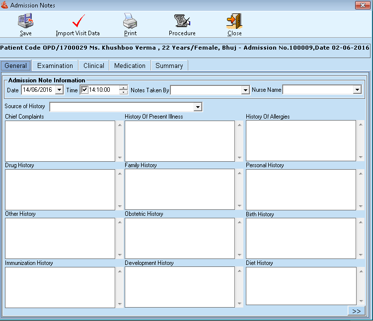 - You can directly submit all the information of the patient by clicking on Admission notes button on the taskbar and the following window will be open.