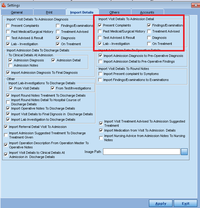 - Check on Import Visit Details to Clinical Details At Admission in Discharge Details.